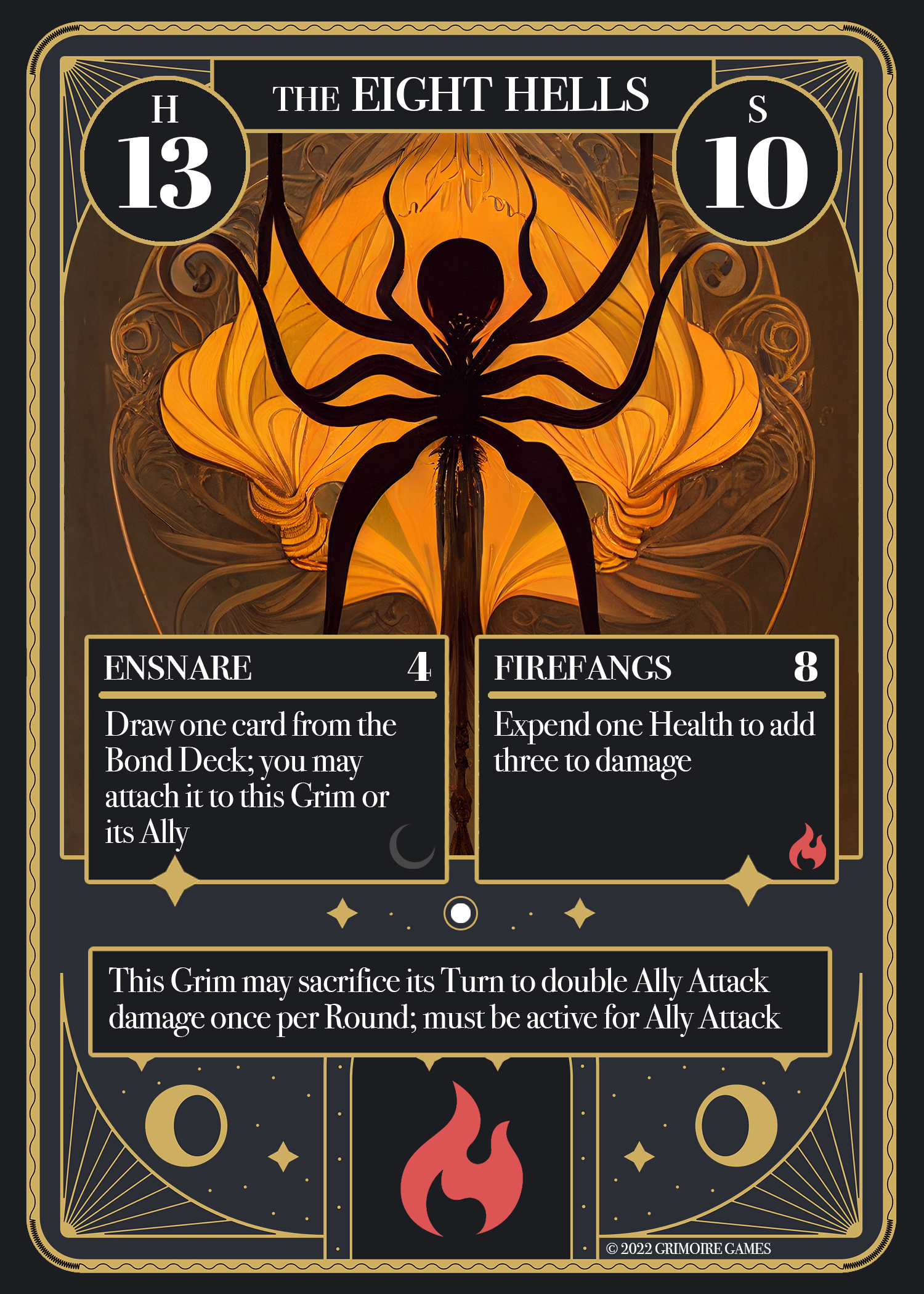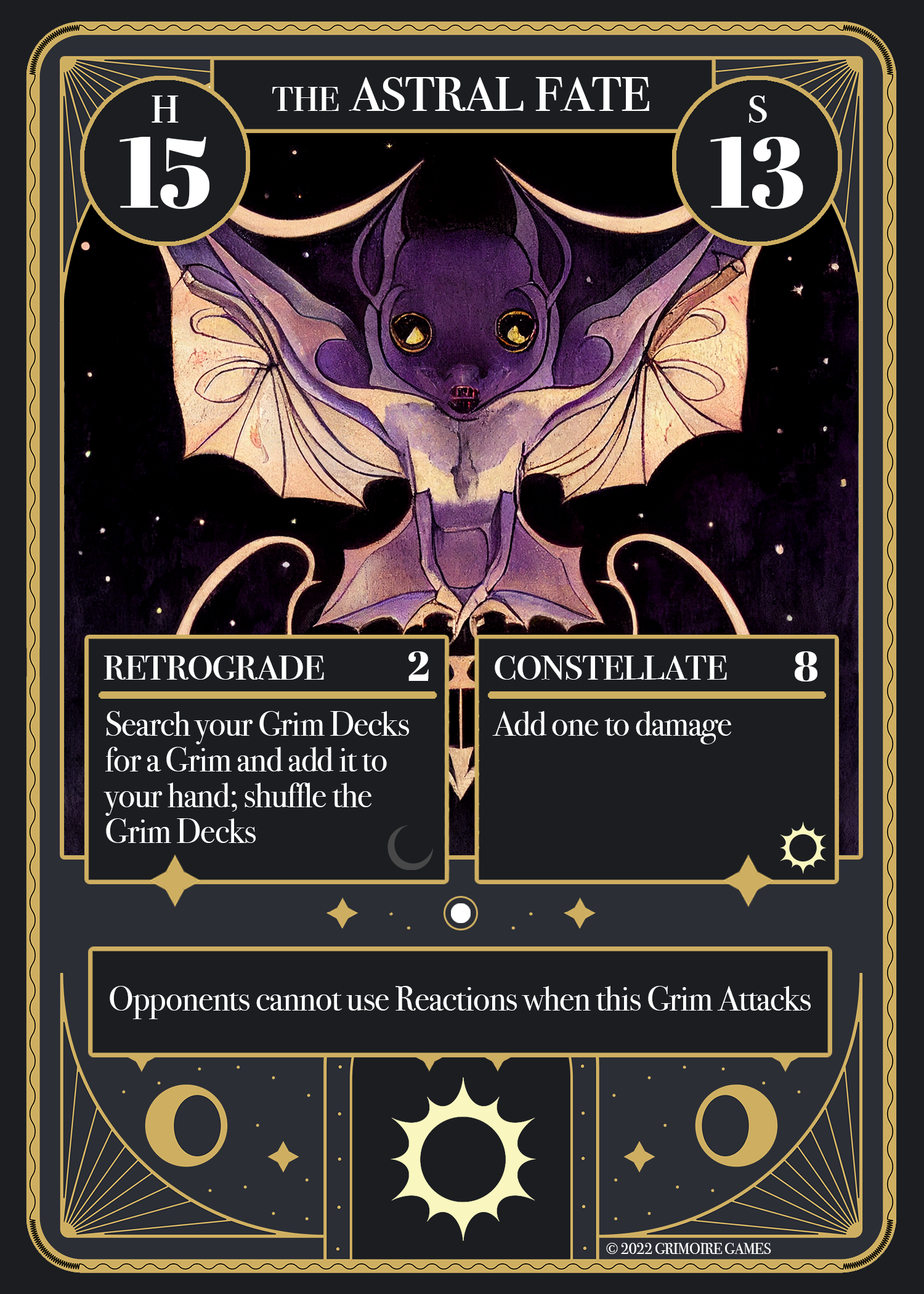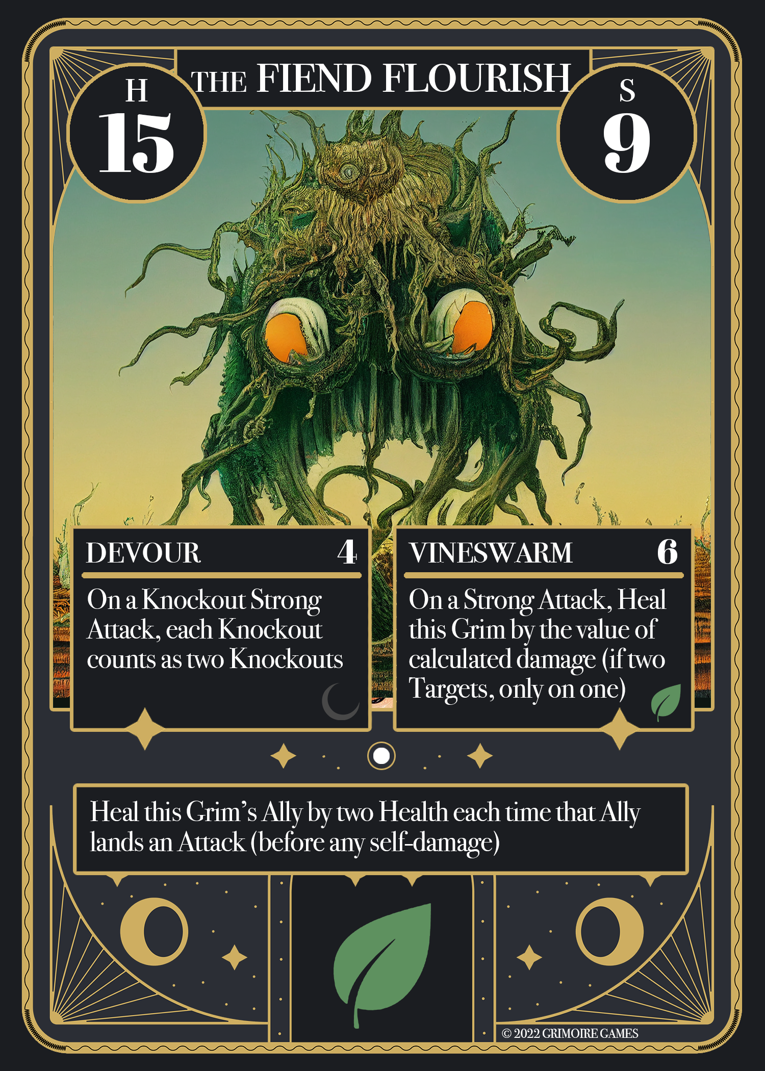 Regarding this Grim's Passive, if any mechanic considers whether a Grim "Healed," that refers to the Grim that gained Health, not the Grim that caused the Healing due to its mechanic (i.e., not this Grim, but its Ally). Also note that a “draw” is not the same as a “search”—if a card is searched for and added to hand, it does not trigger this Passive (see, THE DYED DIVINITY).